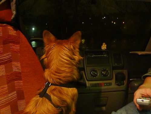 Wir gehen davon aus, dass er auf die Böller wartet, denn er hat noch nie so aufmerksam vorn raus geguckt.