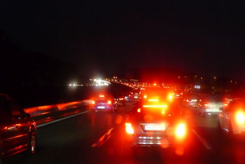 Es fängt gut an. Peter ist pünktlich um 15:00 heimgekommen und wir fahren gleich los. Nach ca. 15 km, also noch vor Aschaffenburg, kommt die Durchsage, dass hinter Waldaschaff 8 km Stau sind. Mist, den können wir nicht mehr umfahren, denn schon stehen wir. Aber nicht in dem angekündigten Stau, sondern in einem ganz frischen. Und da stehn wir dann über ne Stunde, bis die Unfallstelle geräumt ist. Inzwischen ists dunkel geworden, aber endlich gehts langsam weiter.