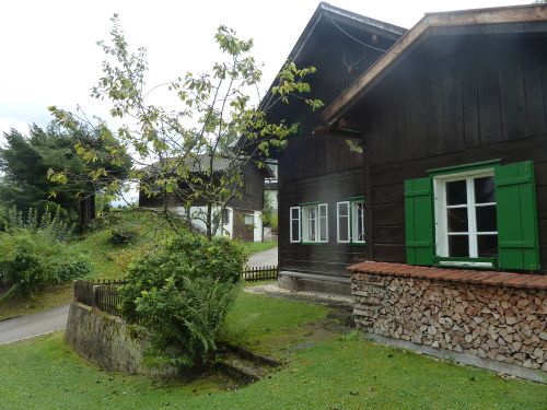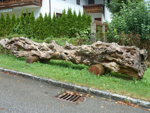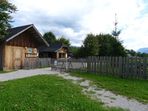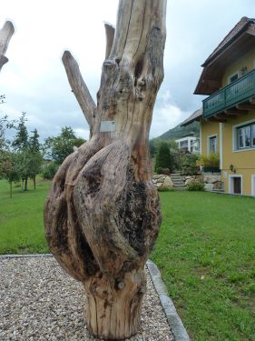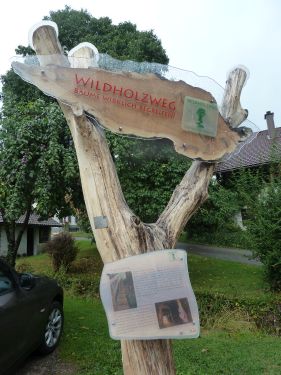 und dort den Berg hoch um uns den Wildholzweg anzuschauen. Es werden geschälte einheimische Bäume gezeigt und deren Nutzung beschrieben.