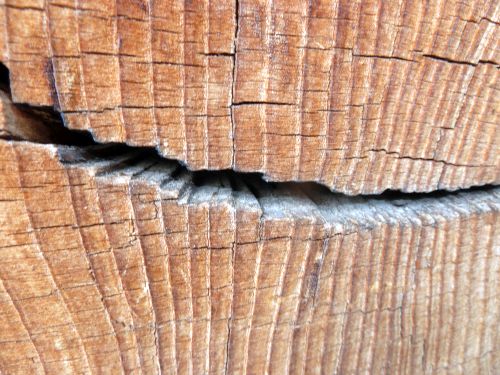 Die Jahresringe sind deutlich erkennbar, denn das Holz liegt bereits seit über 50 Jahren und ist gerissen.