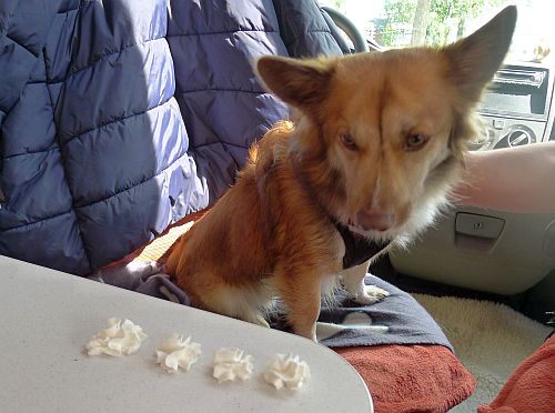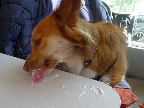 Heute ist unser Hund endlich mal richtig bewegt worden und entsprechend ist sein Appetit. Ein Schälchen Futter reicht ihm nicht, er verlangt mehr. Das sind wir garnicht gewöhnt.
