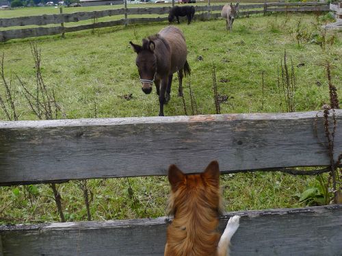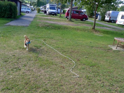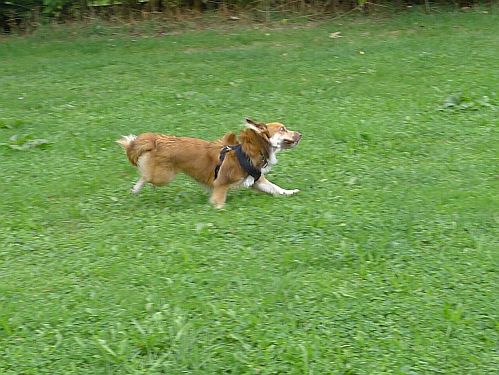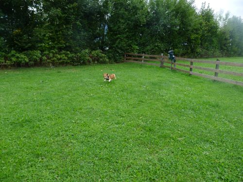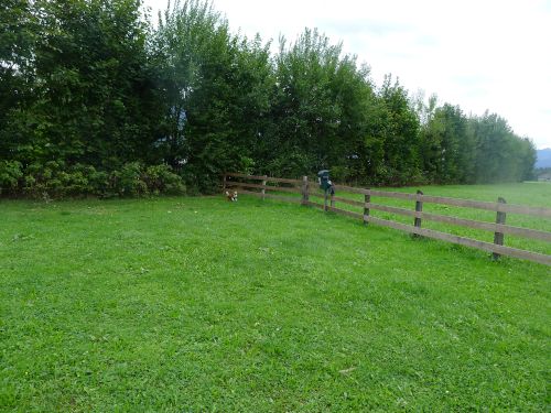 Dann besichtigen wir die platzeigene Hundewiese, und Carl kapiert sofort, was er hier soll. Er dreht seine 30-40 Runden, ist glücklich und froh,