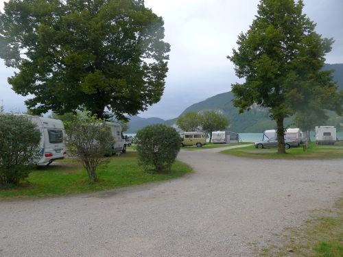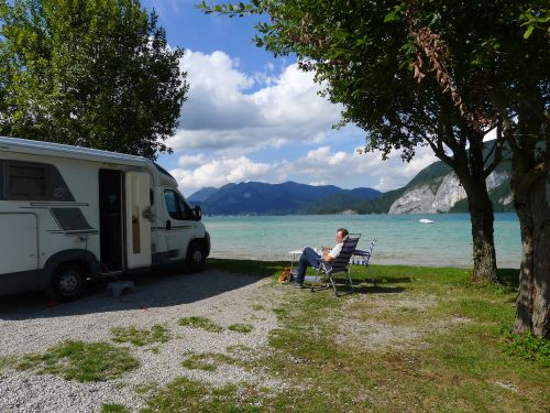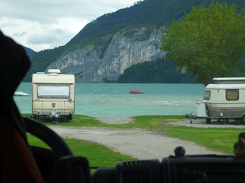 Der Campingplatz dahinter ist zwar noch anfahrbar, liegt aber dermaßen eingepfercht, sodass wir Platzangst kriegen und zurück bis kurz vor St. Gilgen fahren. Hier ist das Hinterland breit und flach und weitläufig, und hier fühlen wir uns wohl. Wir stehen jetzt auf dem Romantik-Campingplatz Lindenstrand, direkt unter der dicksten Linde.