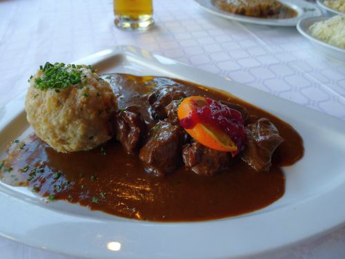 Gamsgulasch, hier im Gebiet selbst geschossen, alldieweil der Gamsjaga nunmal Gemsen jagt. Und seine Vorfahren taten das auch schon. Superlecker.