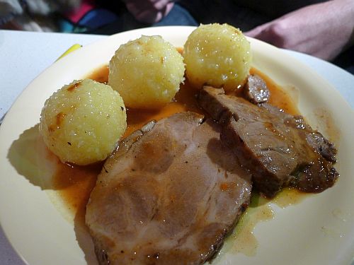 Und heute gibts mal wieder ein Essensbild. Gestern gabs Gulasch mit Pfifferlingen und Nudeln, und heute Schweinsbraten. Peter hat allerdings den Rotkohl verweigert, aber dafür nochmal Nachschlag beim Fleisch und den Knödeln genommen.