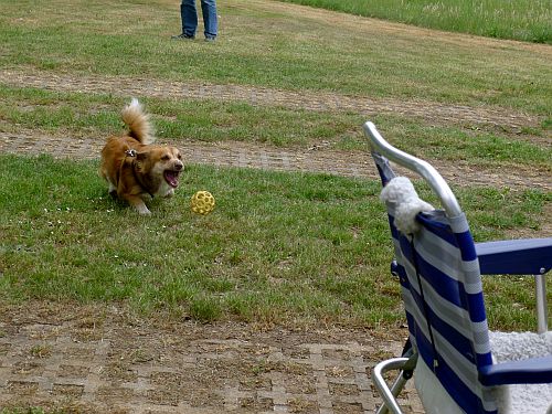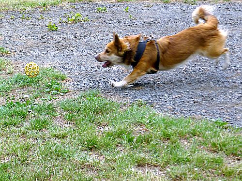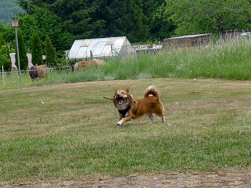 Das erste Gassi befördert jede Menge zäh verpacktes Gras zutage, und anschließend ist unser Daggelchen wieder putzmunter. Uns fällt erst mal ein Stein vom Herzen.