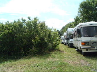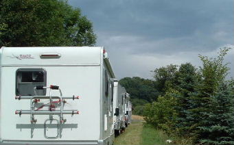 mal 4 Wohnmobile auf einem Feldweg parken,