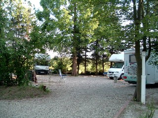 Der Stellplatz liegt idyllisch unter Bäumen direkt am Damm,