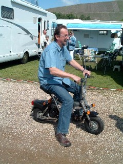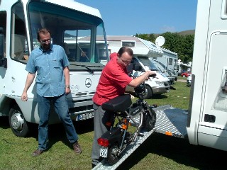 Auch Bernd holt sein Klappmoped unter der Dinette hervor und Peter fährt ne