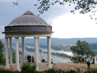 Hier der ursprünglich 1788 gebaute, 1944 zerstörte, und nun gerade wieder neu errichtete Monopteros, ein griechischer Rundtempel. Schon Beethoven und Goethe haben hier ins "überaus prächtige Rheingau" runtergeguckt. Heute tuns Peter und Bernd. Leider hat sich das Wetter noch immer nicht gebessert und die Fernsicht kann man nur erahnen, aber es bleibt wenigstens trocken.