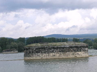 an den Resten der Hindenburgbrücke - einer 1915 eingeweihten und 1945 zerstörten Eisenbahnbrücke über den Rhein - entlang zum benachbarten Campingplatz. Mitten im Rhein kann man noch die Pfeiler sehen, auf denen die 900 m lange Stahl-Bogenbrückenkonstruktion aufgelegen hat.