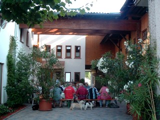 Nun wurde es Zeit für die Wanderung zum Weingut. Im schattigen Hof ließen wir uns die Köstlichkeiten der Küche schmecken und pappsatt gings zurück auf den Platz, wo wir fröhlich den Abend ausklingen ließen.