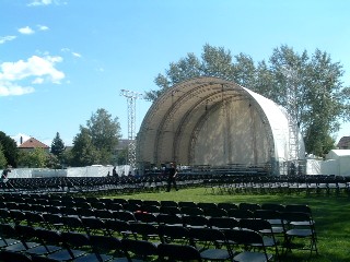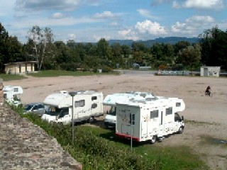 Der Stellplatz liegt direkt am Freibad in einem sehr schön angelegten Grüngürtel, der sich am Neckar entlang bis zur Altstadt zieht. Auf den Neckarwiesen tummelten sich picknickende Familien und auf der Festwiese fanden gerade die Aufbauarbeiten für das am Sonntag stattfindende Konzert von Montserrat Caballe statt.