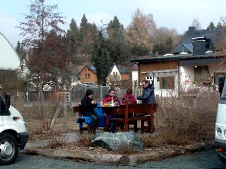 Am langen Tisch wurde geschwätzt und gelacht und nach ein paar Bierchen gings wieder zurück auf den Stellplatz.