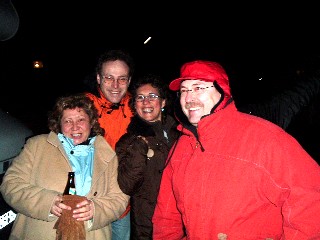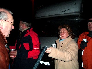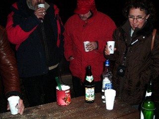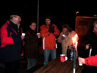 Hier gabs dann bei Fackelschein und leichtem Schneefall ein lustiges Absackerchen. Artur kam mit Wodka-Feige an, in verschiedenen Womos wurde Glühwein heiß gemacht, und Bier und Wein ergänzten das Angebot.