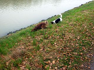 Siggitim kommt zwischendurch mit dem Fahrrad an, überredet uns zu einem Körnchen, und anschließend machen wir einen ausgiebigen Hundespaziergang am Kanal entlang. Das Seminar "Münster" macht sich per Rad auf den Weg, der Rest hält die Stellung bei Lakritzwodka und "offenem Bein".