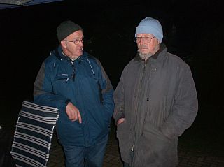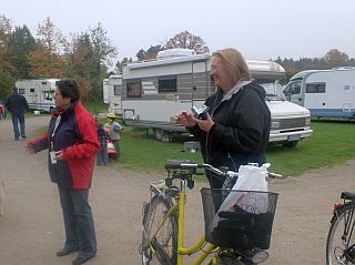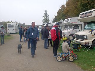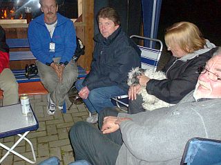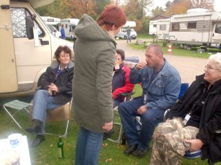 Alte Bekannte und Neue, viele Gesichter und Namen, und erstaunlicherweise einige recht junge Wohnmobilisten. Hardo verteilt die Namensschildchen, alle beschnuppern sich, wir bilden einen Kreis, Glühwein, Schnäpschen und Bier, und immer wieder Neuankömmlinge.