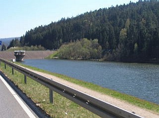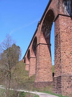 Anschließend besichtigten wir das 1881 vollendete Himbächel Viadukt am Marbachstausee, das mit einer Höhe von 40 m und über 250 m Breite das Mümlingtal überspannt und heute noch von der Odenwaldbahn benutzt befahren wird.