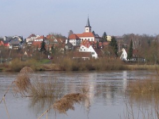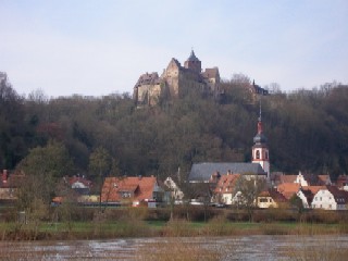 Blick auf die Burg Rothenfels, und schon waren wir nach 5 km in Zimmern und kamen auf die Idee, noch ein paar hundert Meter weiterzulaufen und über die Staustufe auf die andere Seite zu wechseln, um dort mal nach dem Busfahrplan zu gucken. Oh je, der nächste kam erst in fast 2 Stunden. Also mussten wir durchhalten und tapfer gings zu Fuß weiter. Die Burgbesichtigung verschoben wir auf ein andermal und schauten uns stattdessen die Häuser unterwegs an.
