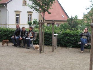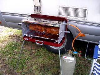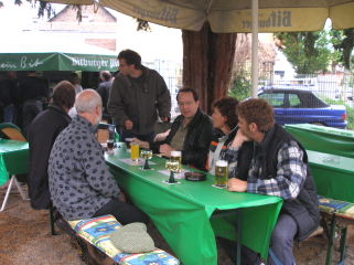 und dann entdecken wir einen Biergarten, und eine Stärkung kann nicht schaden. Nach einem kleinen Schöppchen gehen Bernd und ich zurück zum Stellplatz, um das geplante gemeinsame Spießbratenessen vorzubereiten, denn inzwischen wars schon 16:00 und der Braten braucht seine Zeit. Die anderen wollten gleich nachkommen - wobei "gleich" eine relative Zeitbestimmung ist, wie sich später herausstellte.