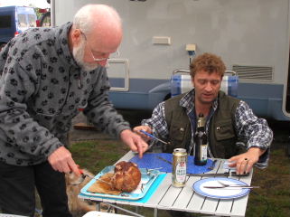 Der Braten brutzelt weiter munter vor sich hin, das Thermometer meint, er sei gleich gar, und Bernd und ich beschließen gerade, die beiden Brocken unter uns aufzuteilen, als endlich auch die fröhliche Biergartengruppe einschlägt. Jetzt schnell die Klöße ins Wasser und es kann losgehen.