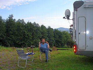 Inzwischen sind 2 Womos auf dem Stellplatz angekommen und vorbei ists mit der absoluten Ruhe. Markise raus, Grill aufbauen, Pflöcke in die Erde hauen, Tische aufstellen - und jeder Handgriff wird von 4 Leuten lautstark kommentiert. Und ach wie ist das lusdisch....