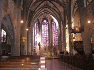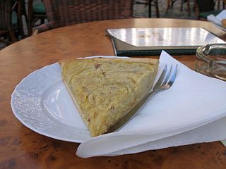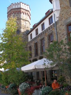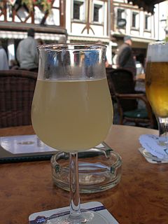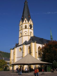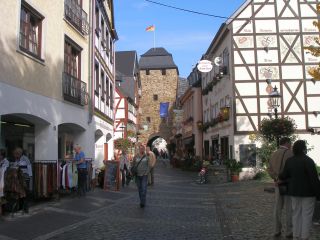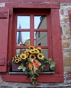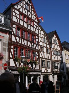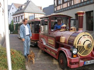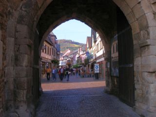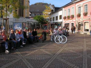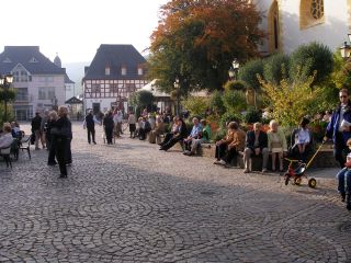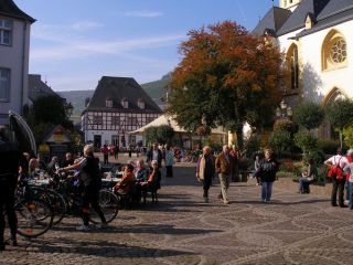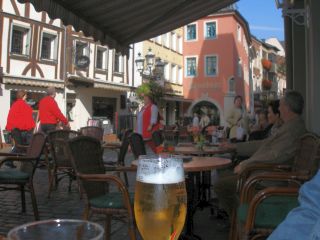Nach einem Besuch in der Kirche machen wir uns auf die Suche nach einem Sitzplatz in einem der Straßencafes. In der ersten Gartenwirtschaft ist nur eine Bedienung zugange, die dem Ansturm nicht gewachsen ist, und nach einer Zigarettenlänge machen wir uns erneut auf die Suche, denn ohne Federweißen und Zwiebelkuchen geh ich nicht zurück auf den Campingplatz.
