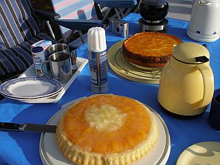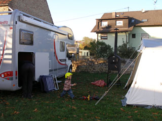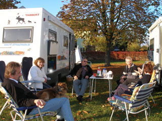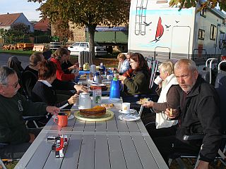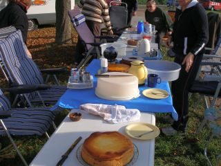 Nachdem die Sonne sich endlich durchgekämpft hat, genießen wir wieder den goldenen Oktober, während nach und nach weitere Womos eintreffen. Dann wirds Zeit für die Kaffeetafel.