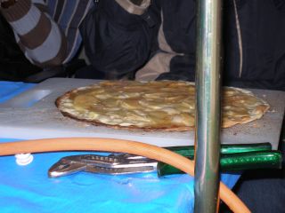 Dann gehts endlich los. Alexander wird rührig und unermüdlich versorgt er uns mit Flammkuchen bis tief in die Nacht hinein. Dazu gibts Federweißen und Federroten, der hier Neie oder Bizzler heißt, und in den Därmen kräftig rumbizzelt.