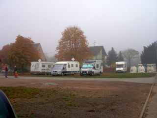 Heute Nacht warens nur knappe 3-5°, so ganz genau weiß mans nicht, und noch hängt der Nebel tief überm Platz an der Feuerwehr.