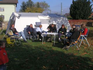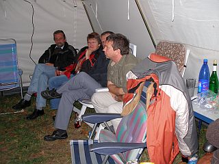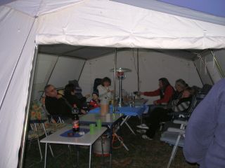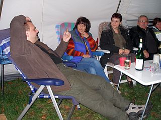 Den Abend verbringen wir wieder in lustiger Runde im warmen Zelt - hier nochmal danke an Manni, denn ohne Zelt wären wir bestimmt alle erfroren, und auch Renates Strahler hat prima Dienste geleistet. Und wenn ich schonmal am Dankesagen bin: es war wieder mal ein sehr schönes und lustiges Treffen, und wir bedanken uns bei allen Spendern für die zahlreichen Leckerchen in fester und flüssiger Form.