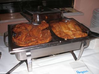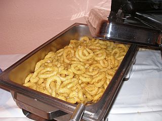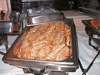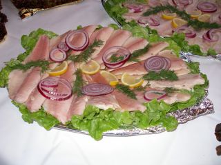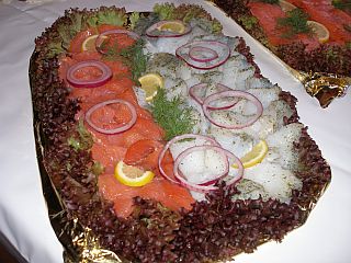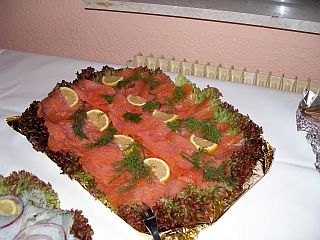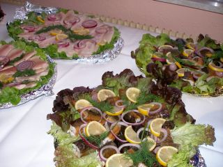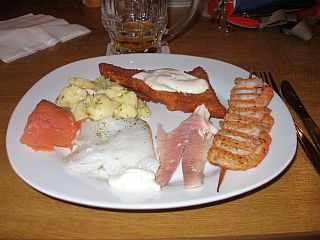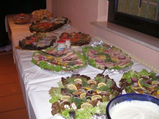Pangasius, Zander, Tintenfisch, Garnelenspieße, Krabbencocktail, Heringssalat, Kartoffelsalat, Pellkartoffeln, Forellenfilets, Räucheraal, Lachs und Heilbutt gibts, und es ist ein schweres Stück Arbeit, alles zu probieren. Inzwischen grummelt mein Bauch schon wieder, denn der Bizzler bizzelt wieder rum. Mit einem Kümmel wird er erst mal besänftigt und danach gehts im Eilschritt zurück zur heimischen Nasszelle.