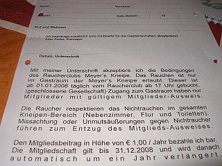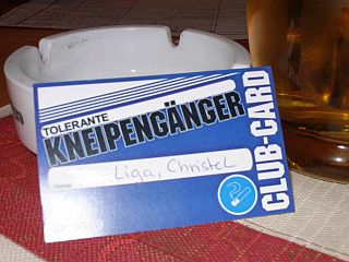 Nach kurzer Erledigung der Formalitäten werden wir Mitglied und können uns nun als tolerante Kneipengänger ausweisen. Mit dieser Club-Card haben wir Zutritt zu 3 Kitzinger Raucherclubs.