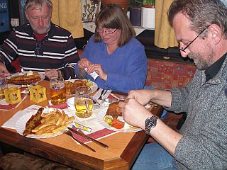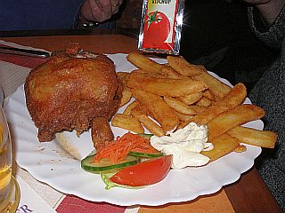 In der urigen Kneipe lassen wir uns nun Curry-Wurst, Hähnchen und Pommes rot-weiß schmecken. Dazu lecker Bierchen, und alles ist bestens.
