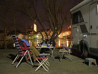 Bis spät abends sitzen wir anschließend noch zwischen den Womos, mit Blick aufs beleuchtete Kitzingen. Was will man mehr.