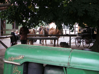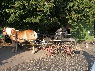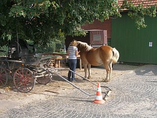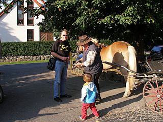Werner hat uns nun zu einer Kutschfahrt eingeladen und ich hab mich eigentlich auf den Planwagen eingestellt. Aber nix ists. Er spannt Marco vor diese gefährliche Sportkutsche. Ohje, kneifen gilt nicht, denn Julia ist ganz heiß drauf. Also gut, wenn sogar der Lütte mit Opa fahren darf, wirds wohl nicht so wild werden. Hardo steigt ebenfalls auf und los gehts.