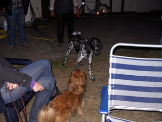 Abfahrt kurz nach halb vier, fast 400 km liegen vor uns, und erstmals fahren wir vollbesetzt, d.h. Julia und Brunos Schwester (Frauchen ist mal kurz in Peking) fahren mit. Peter muss geschäftlich nach Melle und Julia braucht ein wenig Auszeit vom Examensstress. Die Hunde finden gleich ihren Platz unterm Tisch und Julias Reisetasche bildet die Barriere zum Fahrerhaus. Also gehts auch ohne das blöde Geschirr, und sie kuscheln sich aneinander. Als wir Peter abholen steigt er freiwillig hinten ein und los gehts. Die ersten hundert Kilometer läufts recht ruhig, und nach dem Hundegassi im Sauerland darf Peter fahren. Kluge Entscheidung, denn nun wirds voll auf der Autobahn. Nach zwei oder drei kurzen Staus sind wir dann endlich kurz vor acht bei Werner-Jonathan in Westkilver auf dem Erlebnishof Fülling gelandet.