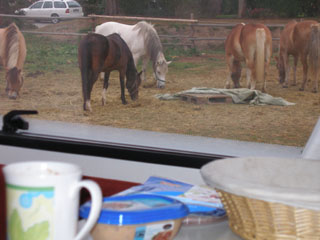 Herrlich so ein Frühstück mit frischgebackenen Brötchen und Pferden vorm Fenster.