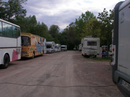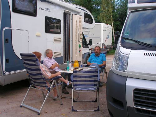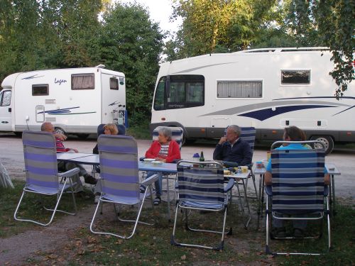 Also gehts Freitag kurz nach 16:00 los, und da ich die Ausfahrt zum Stellplatz verpasst habe, kommen wir erst gegen 17:00 dort an. Der Platz ist voll, und auch der Parkplatz davor bis auf den letzten Platz besetzt. Aber Wiebke und Konrad haben einen Platz freigehalten und so stehen wir nun als Kuschelcamper ziemlich nah beieinander.