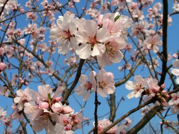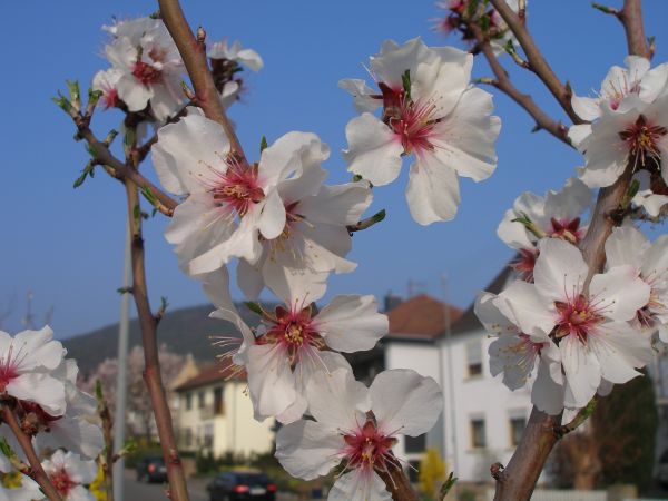 einmal die rosa Ziermandel, die nur schön aussieht, aber nicht essbar ist, und dann die essbare Krachmandel, deren Blüten weiß mit einem rosaroten Auge sind.