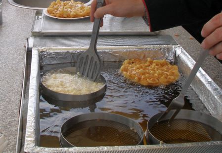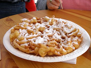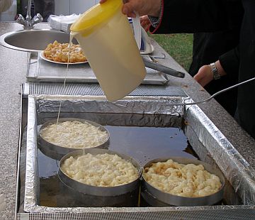 In einem dünnen Strahl wird der Teig kreuz und quer in einen im heißen Öl schwimmendem Tortenring laufen lassen und ausgebacken. Puderzucker drauf, fertig. Lecker.