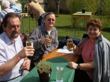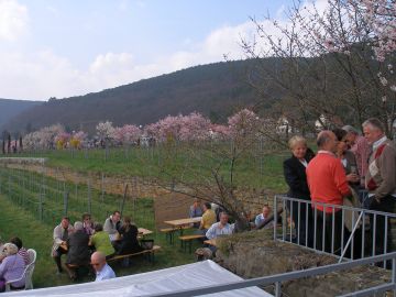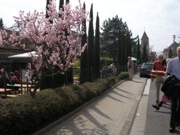 Das Wetter sieht zwar noch etwas diesig und durchwachsen aus, aber es ist herrlich warm. Gegen Mittag gehts dann endlich los. Königsbach liegt direkt neben Gimmeldingen, und der Blütenpfad zieht sich vom Ortsrand aus an den Weinbergen entlang ins Nachbarstädtchen. Am Wegrand sind Stände aufgebaut, um die hungrigen und durstigen Blütenwanderer zu versorgen.