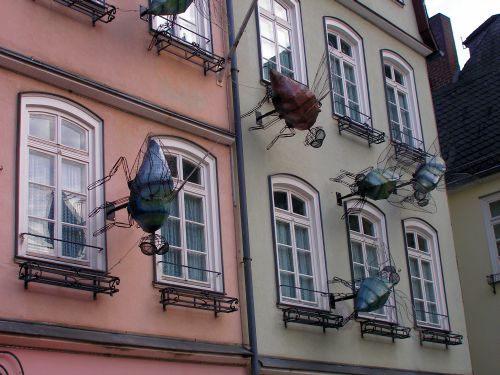 Den Einstieg in den Grimm-Dich-Weg haben wir nicht gefunden, wohl aber die 7 Fliegen, die auf dem Marktplatz an einer Hauswand sitzen.