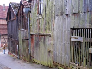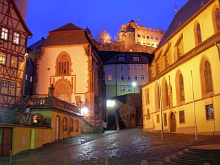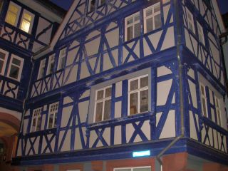 Bei dieser Beleuchtung glänzt das blaue Haus, das einzige bekannte smalteblaue Fachwerkhaus, besonders schön. Smalte ist ein in Glas eingeschmolzenes Kobalt-Blau, das als kleinste Glassplitter in Öl gebunden eine streichfähige Farbe ergibt.