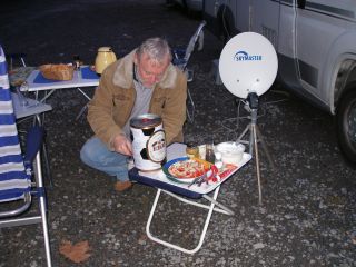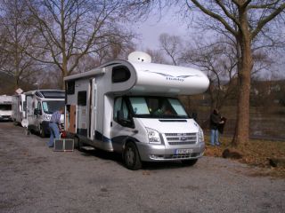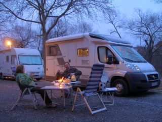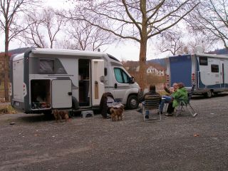 Kaffee und Kuchen haben wir uns nun redlich verdient und so genießen wir das zaghaft beginnende Frühlingswetter vor den Womos.
