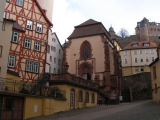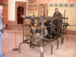 Weiter gehts Richtung Burg. Aber erst mal müssen wir in die Kilianskapelle hinein, denn hier war bisher immer die Tür verschlossen. Enttäuschend allerdings die Einrichtung, denn es gibt keine. Stattdessen steht mitten drin ein rostiges Monstrum, das ein mittelalterliches Uhrwerk sein soll. Allerdings bewegen sich alle Teile irgendwie separat, also keine Ahnung, wie das Ding funktioniert haben soll.