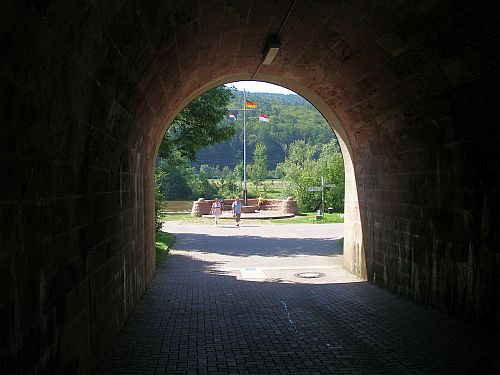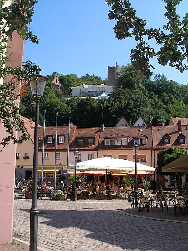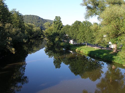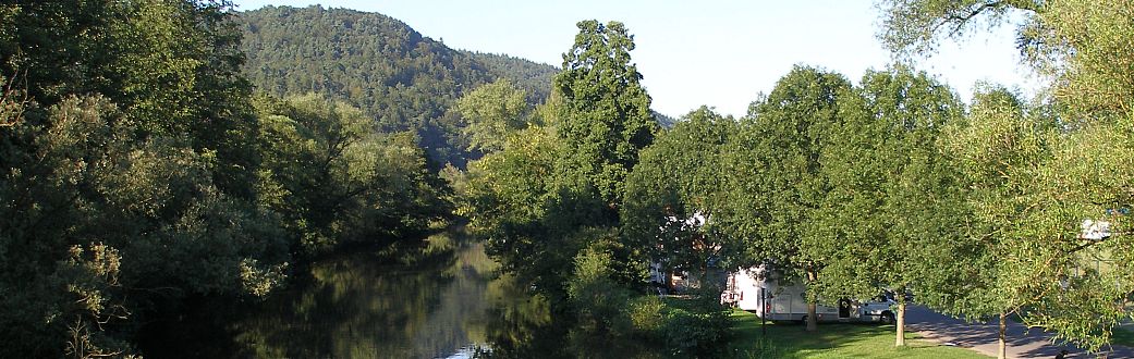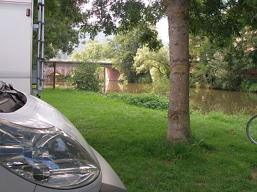 Die Autobahn ist vor Aschaffenburg wieder mal dicht, aber wir nehmen die Ausfahrt Goldbach und haben nun freie Fahrt durch den Spessart. Trotzdem sind wir gute 2 Stunden unterwegs. In Karlstadt angekommen ists erst mal schwierig, den Platz zu finden, und dann sind wir so richtig enttäuscht, denn die Stellplätze liegen am Rand des Großparkplatzes und sind natürlich alle besetzt. Klar, die Plätze sind kostenlos und es ist herrliches Sommerwetter. Wir müssten also auf einen freien PKW-Parkplatz warten. Bernd steht zwar noch irgendwie annehmbar quer am Rand, aber ist auch der Meinung, dass das nix ist. Also Anruf bei Wiebke, wir fahren weiter nach Gemünden, und die beiden kommen nach.