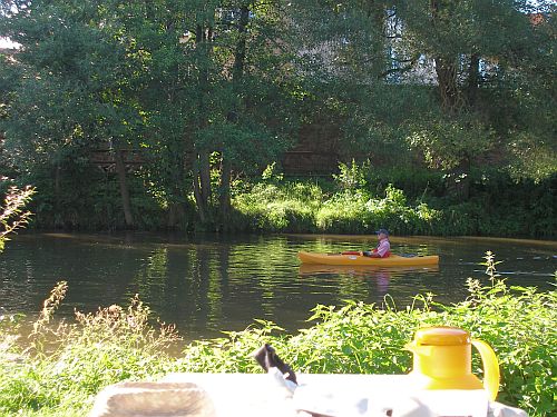 Noch ein paar Schritte am Main entlang.... und schon wirds Zeit fürs Mittagsschläfchen bzw. Peter versucht den Nachtschlaf nachzuholen. Konrad macht eine Radtour nach Karlstadt, der Rest sitzt rum und relaxt mit Blick auf die langsam vor sich hin fließende Saale und die Kanufahrer.
