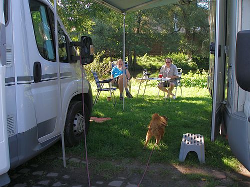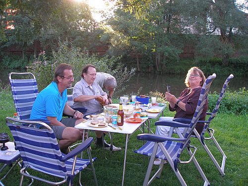 Wir richten uns häuslich ein, können direkt am Ufer der Saale sitzen, alles ist gut.
