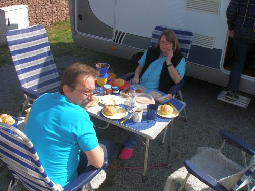 Jetzt packen wir wieder mal Tisch und Stühle aus und setzen uns wieder in die Sonne und trinken den restlichen Kaffee vom unterbrochenen Frühstück fertig.